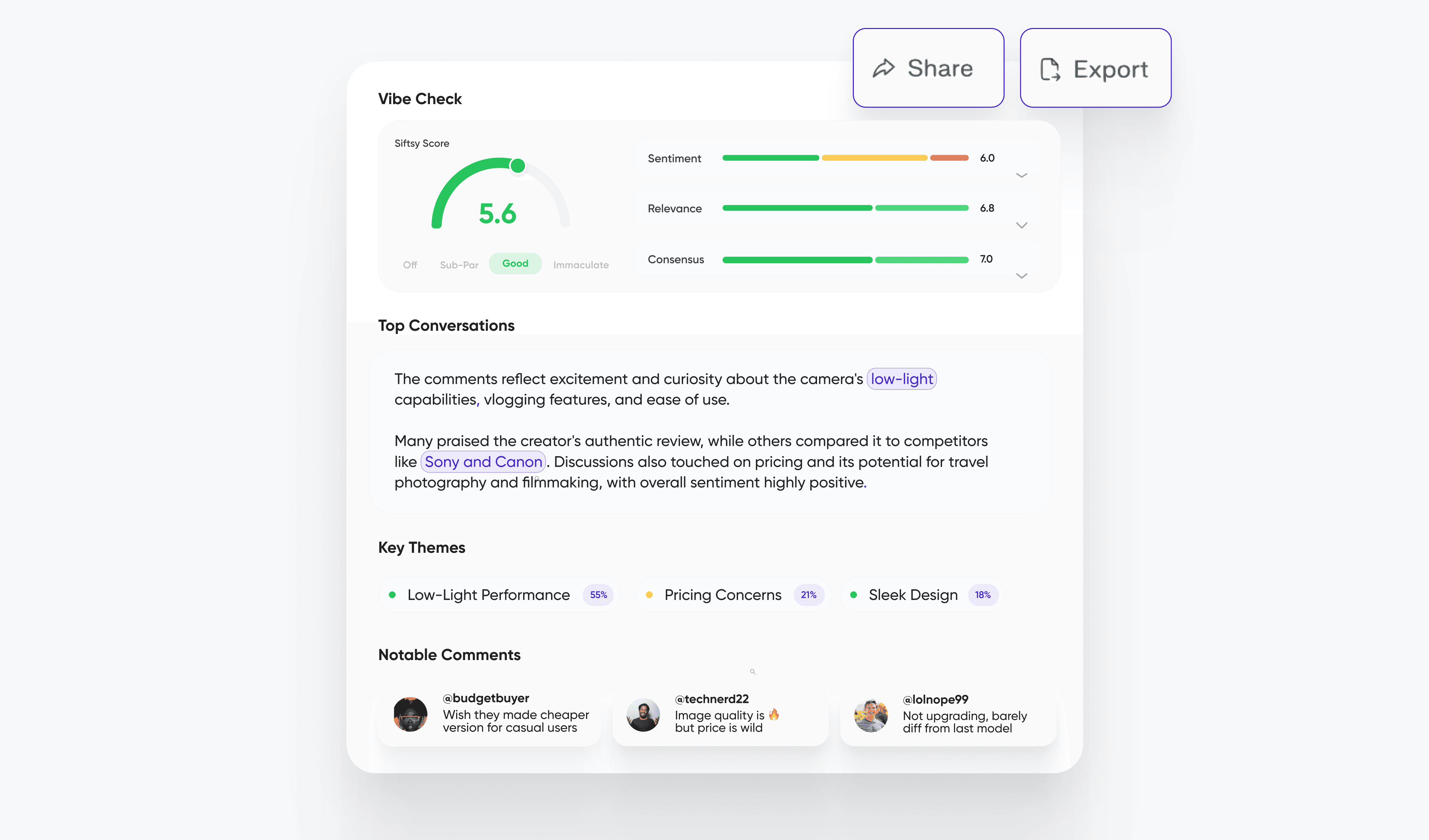 Siftsy analyzes, summarizes, and scores comments — turning raw reactions into insights that guide campaigns, products, and strategy.