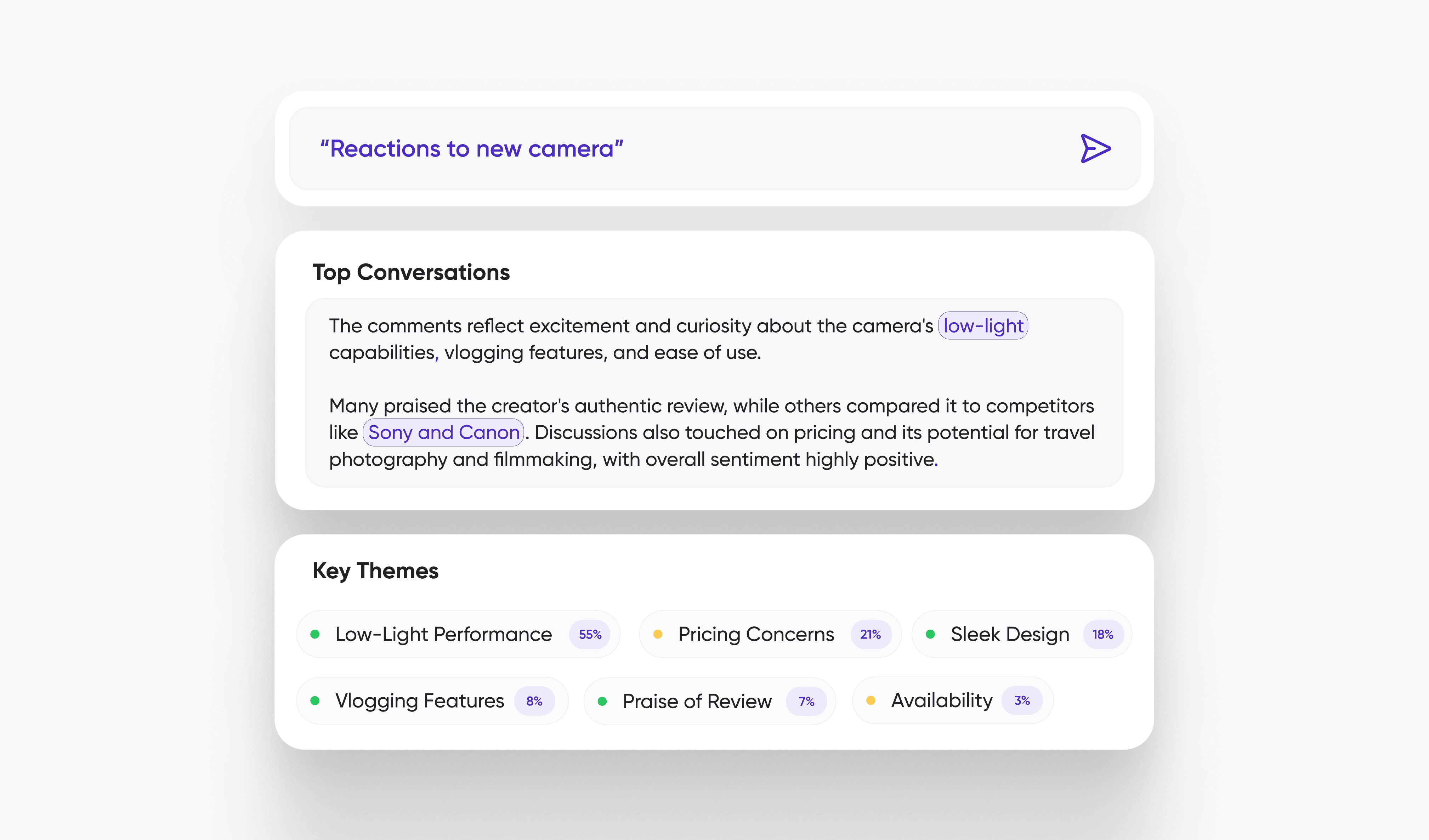 Shape the conversation, don’t just moderate. Surface FAQs, spot emerging themes, and step in early to guide the tone. Turn comment chaos into community insight.
